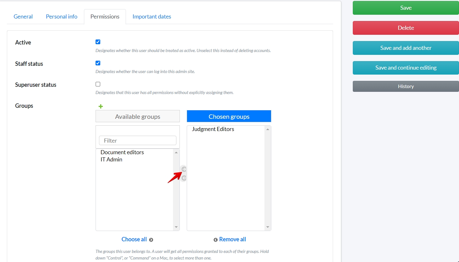 Attribuez-leur un groupe en le sélectionnant parmi les groupes disponibles et en le déplaçant à l'aide de la flèche droite au milieu vers la section des groupes choisis.